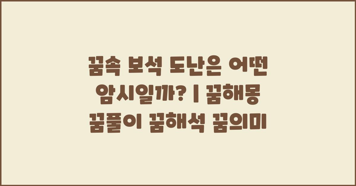 꿈속 보석 도난은 여러 감정과 상황을 반영하는 복잡한 꿈이에요. 이 꿈은 소중한 것을 잃는 것에 대한 불안과 염려를 상징할 수 있으며, 이러한 꿈의 해석은 각 개인의 상황에 따라 다르게 적용될 수 있습니다. 꿈을 통해 내면의 소리를 듣고 이를 해결하려는 노력이 필요할 것입니다. 꿈속 보석 도난, 어떤 의미를 담고 있을까? | 꿈해몽 꿈풀이 꿈해석 꿈의미에 대해 좀 더 알려드리고 싶어요!