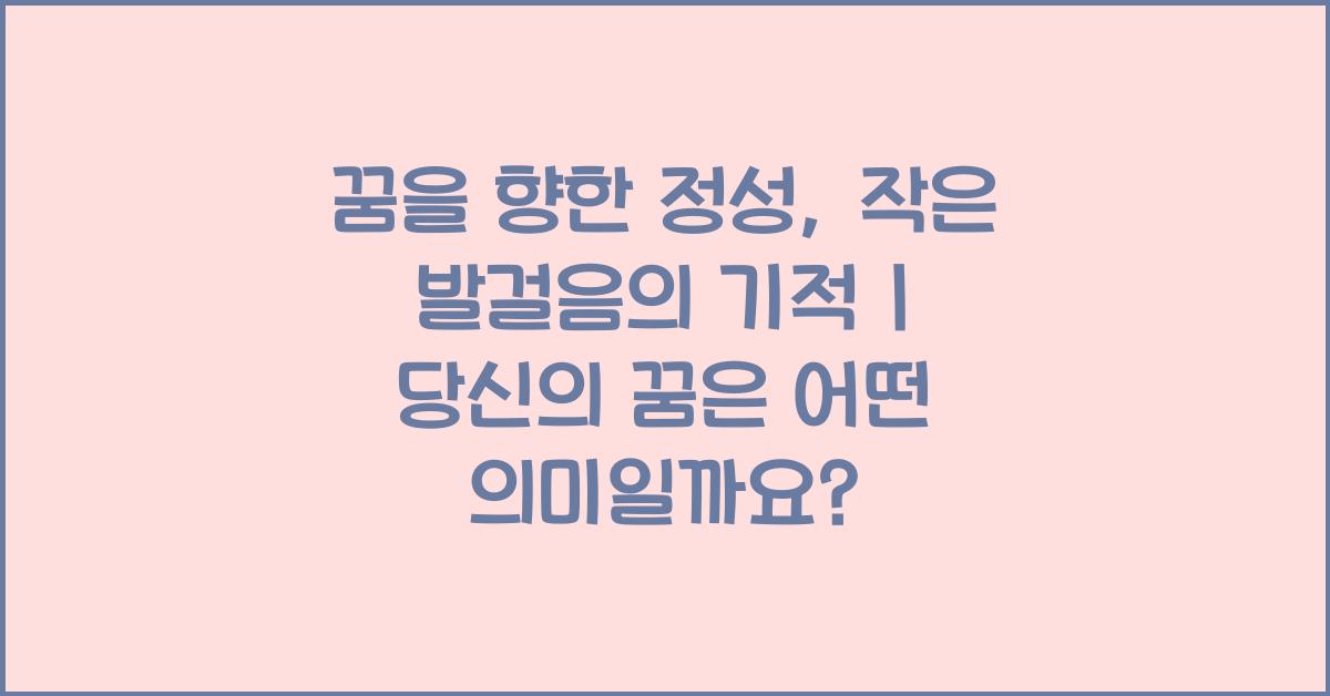 꿈을 향한 정성, 작은 발걸음의 기적 | 꿈해몽 꿈풀이 꿈해석 꿈의미가 우리 삶에 어떻게 적용될 수 있는지를 나는 수도 없이 목격했습니다. 장기적인 목표를 위해 매일의 작은 행동이 얼마나 중요한지를 귀납적으로 이해하고 있습니다. 이렇게 선택의 연속이 결국 꿈을 이루는 길임을 깨닫게 됩니다.