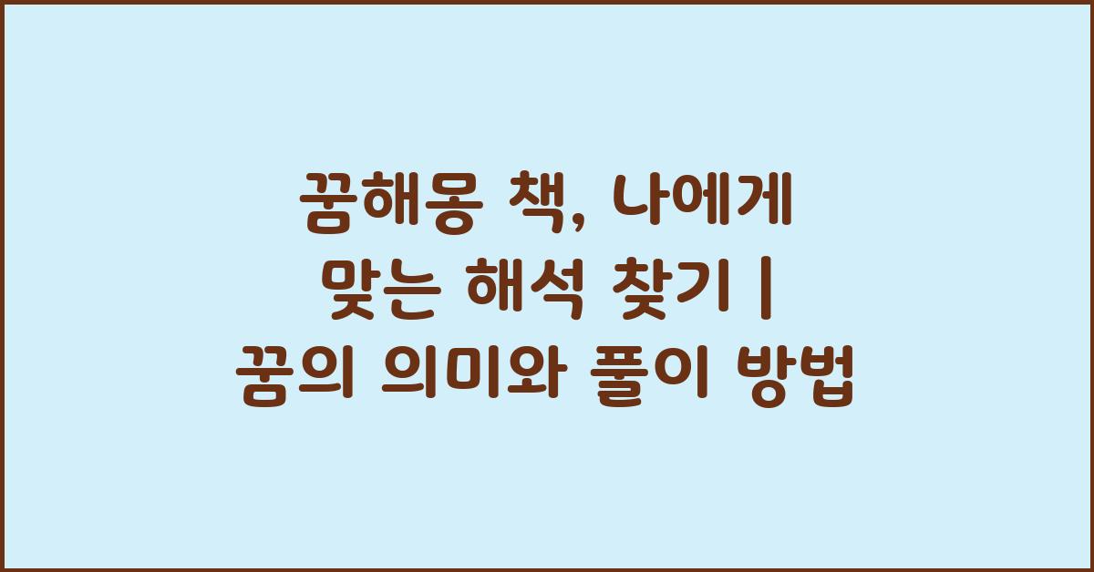 꿈해몽 책, 나에게 맞는 꿈 해석 찾기 | 꿈의 의미와 풀이 방법을 통해 여러분은 꿈의 다양한 세계를 탐험할 수 있습니다. 꿈은 단순한 수면 중의 장면이 아니라, 우리의 내면세계와 삶을 들여다보는 창입니다. 여러분도 저와 함께 꿈의 의미를 발견해 나가보시길 바랍니다!