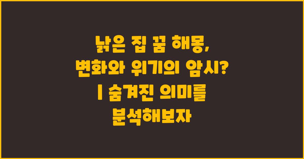 우리가 꿈 속에서 낡은 집을 보는 것은 종종 여러 의미를 내포하고 있습니다. 일반적으로 낡은 집의 꿈은 과거의 추억, 내면의 갈등 또는 다가오는 변화에 대한 신호로 해석될 수 있습니다. 낡은 집 꿈 해몽: 변화와 위기의 암시? | 꿈해몽 꿈풀이 꿈해석 꿈의미 에서 자주 언급되는 주요 포인트 중 하나는 바로 이러한 상징성을 인지하는 것입니다. 예를 들어, 꿈에서 오래된 집을 발견하고 그 안을 돌아보았다면, 이는 현재의 상황이 아닌 과거로부터 자신이 겪어온 경험이나 감정을 직면하라는 뜻일 수 있습니다.