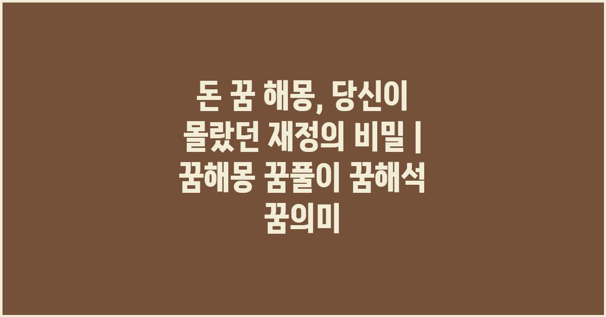 돈 꿈 해몽: 당신의 잠재력을 깨우는 꿈 | 꿈해몽 꿈풀이 꿈해석 꿈의미를 통해 자신의 재정 상황뿐만 아니라 개인의 내면을 들여다보는 기회를 얻을 수 있습니다. 꿈 속에서의 돈은 단지 물질적 가치에 국한되지 않고, 여러분의 삶에 대한 깊은 열망과 두려움을 반영합니다. 지금 이 순간에도 여러분은 그 꿈 속에서 무언가를 배우고 성장할 수 있는 기회를 포착하려고 하시죠?