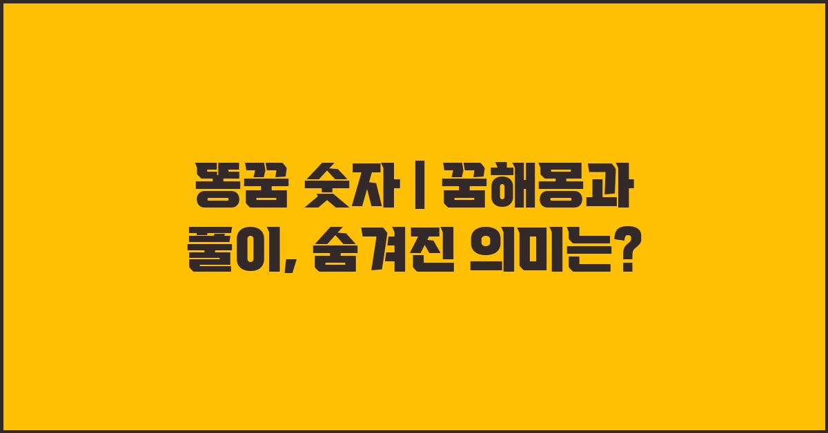 꿈을 해석하는 것은 간단한 과정이 아닙니다. 개인의 경험, 감정, 심리적 상태가 복합적으로 얽혀있기 때문에 여기에 맞춰 해석을 진행해야 합니다. 똥꿈 숫자 | 꿈해몽 꿈풀이 꿈해석 꿈의미를 찾을 때는 자신만의 해석이 필요하고, 이를 통해 심리적인 통찰을 얻을 수 있습니다. 이 과정에서 여러분의 내면과 대화하게 되고, 상처가 치유되며 성장하게 됩니다.